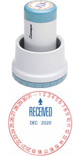 This 6-year XpeDaters come with Red Outer Ring for the day and Blue RECEIVED (copy) and Date. The year band also prints: A.M., P.M., REC'D, PAID, FAX'D. This stamp comes with an inked base for a permanent home on a desk or counter top.