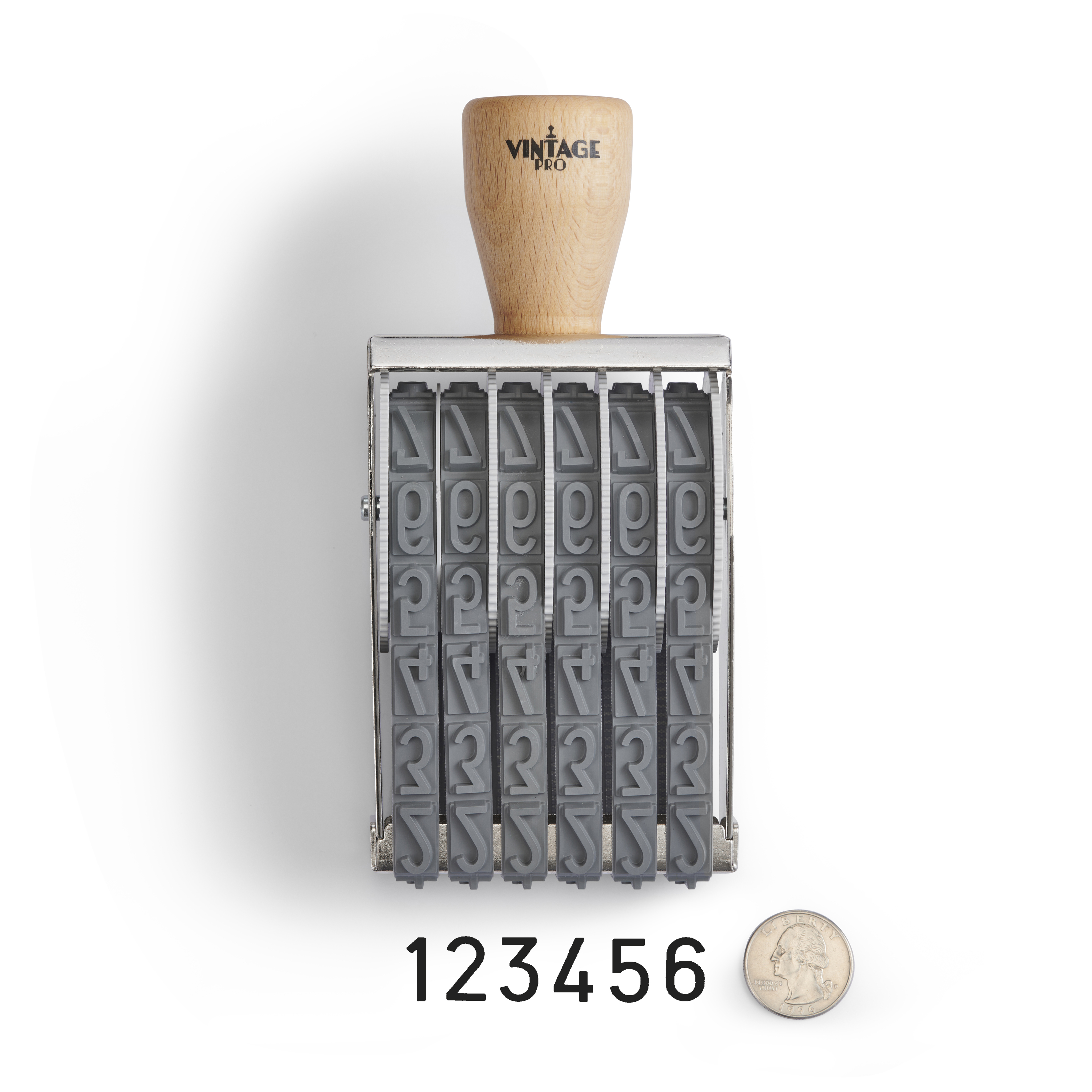 Vintage Pro Numbering 6 Band 5/8" Character Stamp Size 4, 5/8" Characters, 6 Bands This 6 band numbering band stamp has character size of #4 Band, or 5/8" characters. The Vintage Pro band stamps comes with 0-9 numbers bands, or you can choose to replace the 0-9 with either the A thru M or N thru Z Bands. The sturdy wooden handle and quality metal frame will give you a great impression each and every time. This stamp is used with a separate rubber stamp pad. - SELECT HOW YOU WANT THE STAMP TO LOOK BELOW. - THEN ENTER THE QUANTITY. - THEN CLICK ADD TO CART.